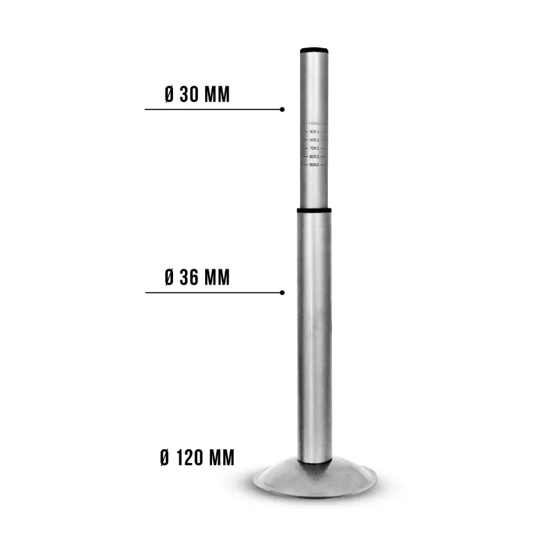 - Materiali: Combinazione di acciaio verniciato a polvere per la base e tubo esterno, e alluminio per il tubo telescopico interno con scala di misurazione.