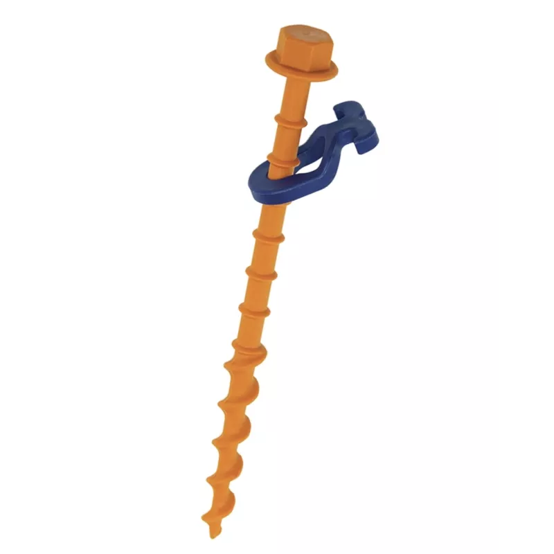 Pioli a vite in plastica di Peggy Peg. Leggero ma con una presa molto migliore. Set di 12 picchetti a vite, compresi i ganci abbinati.