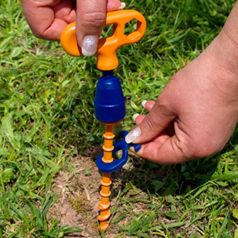 Grazie alla regolazione standard dell'altezza, il campeggio è ora ancora più facile, con i picchetti in plastica di Peggy Peg. Avvitare il piolo nel terreno, a mano o con il trapano a batteria. Non appena senti una "resistenza", smetti di girare. Quindi fai "clic" sul gancio blu a livello del suolo. Ciò impedisce l'effetto leva che hanno altre marche di pioli.