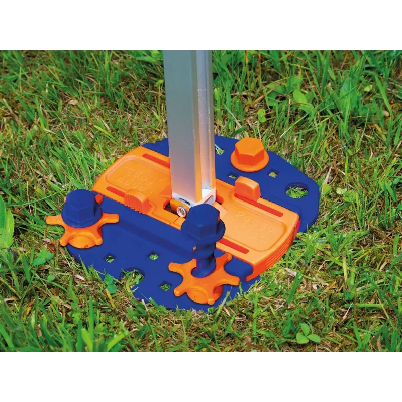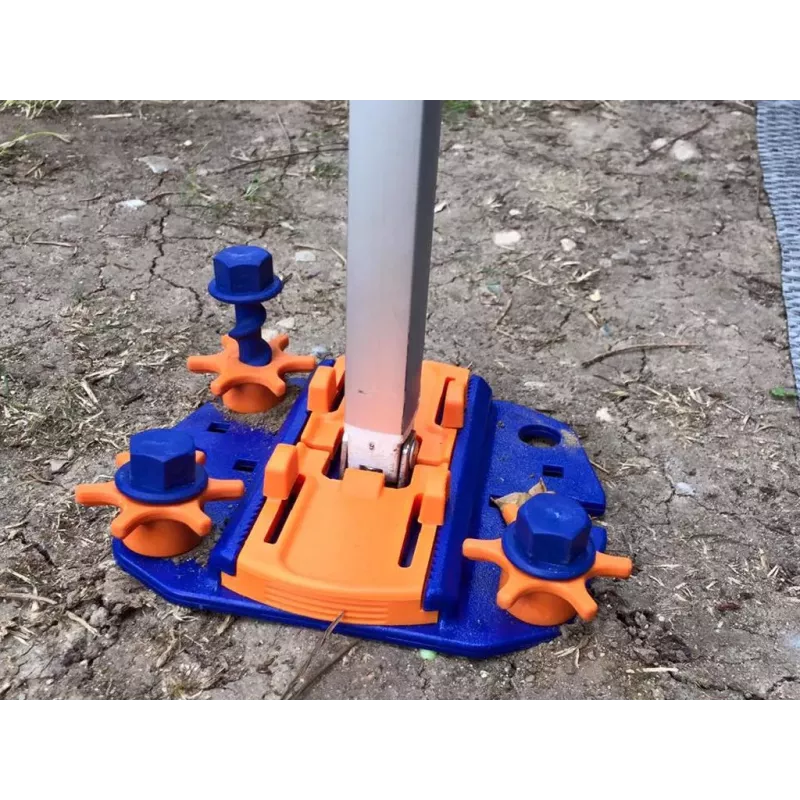 Possono essere usate anche per fissare al suolo le cinghie antitormenta utilizzando gli appositi ganci. Grazie al design brevettato, tutte le comuni gambe della tenda da sole rimangono saldamente a terra. Le due parti arancioni scorrono semplicemente sulla base della tenda da sole o della gamba della tenda.
