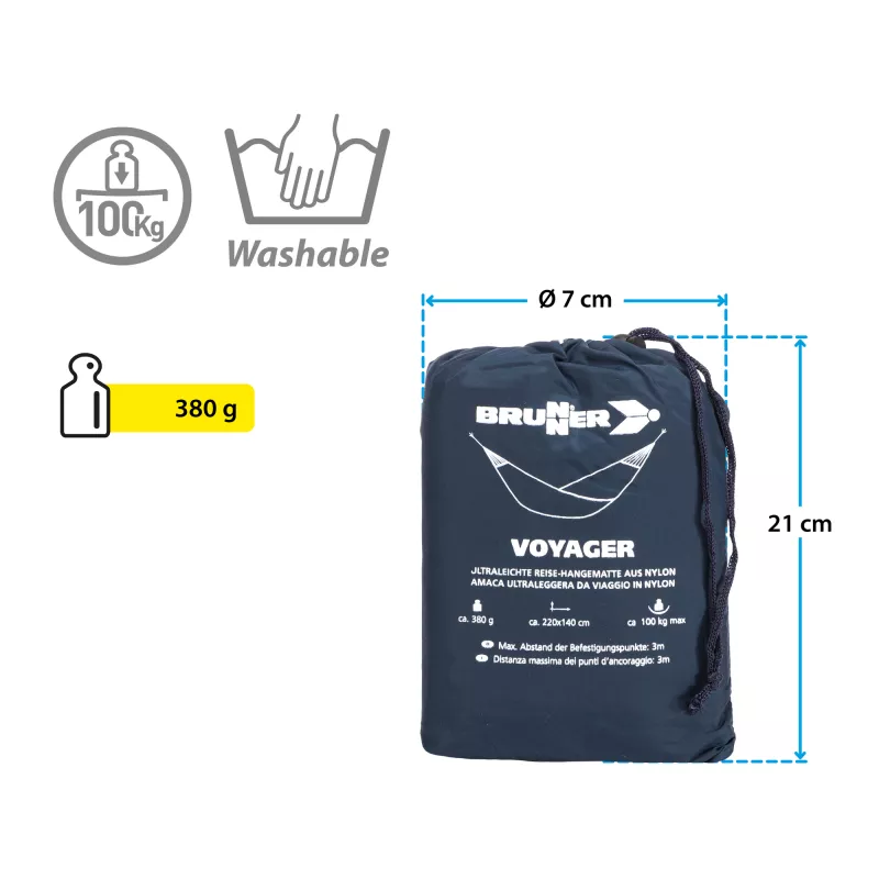 La Brunner Voyager è un’amaca ultraleggera e compatta, progettata per offrire il massimo comfort durante il campeggio, i trekking o i momenti di relax all’aperto. Realizzata in tessuto resistente e traspirante, si monta in pochi istanti e si ripiega facilmente in una sacca integrata, risultando ideale per chi viaggia leggero.