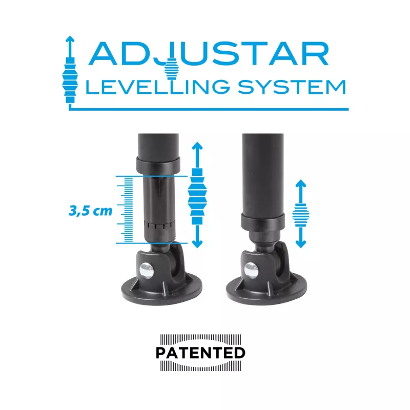 - Tutte le 4 gambe regolabili in altezza, con sistema di livellamento “Adjustar” su una gamba