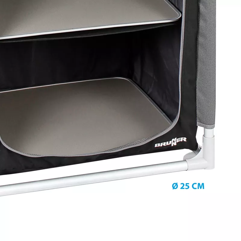 Il Brunner Azabache LS è un mobiletto da campeggio pratico e compatto, ideale per l’organizzazione di utensili, stoviglie o indumenti durante le attività all’aperto. La struttura in alluminio e il rivestimento in tessuto resistente lo rendono perfetto per l’uso esterno, garantendo al tempo stesso leggerezza e solidità.