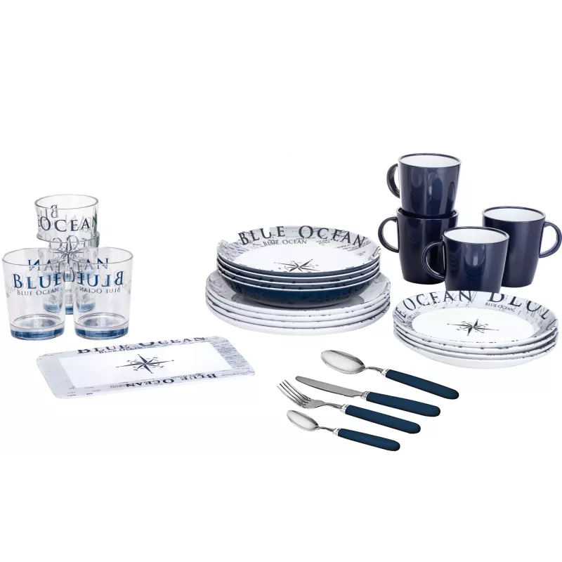 Il set Brunner All Inclusive Blue Ocean è la soluzione completa per chi desidera unire eleganza e funzionalità durante le proprie avventure all'aperto. Realizzato in melamina di alta qualità con finitura "Stone Touch", questo set da 36 pezzi offre un design raffinato e una resistenza superiore, perfetto per campeggi, picnic e viaggi in camper.