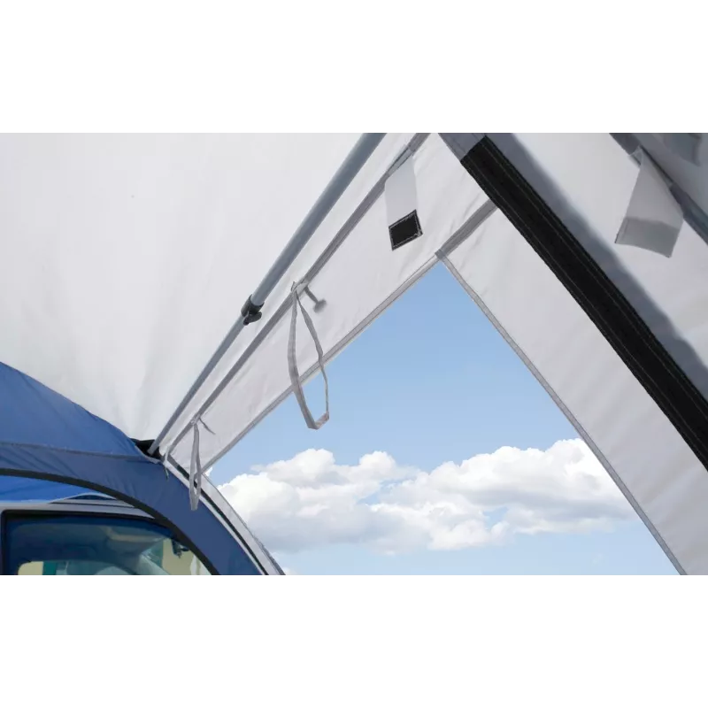 La presenza della balza perimetrale e di un efficace sistema di controventatura contribuisce a migliorare la stabilità e la protezione dalle correnti d’aria. La veranda Entrada può essere collegata al veicolo tramite profilo di scorrimento, asta di collegamento oppure nastri per corrimano con chiusura a contatto, garantendo grande flessibilità di installazione.