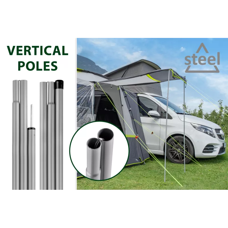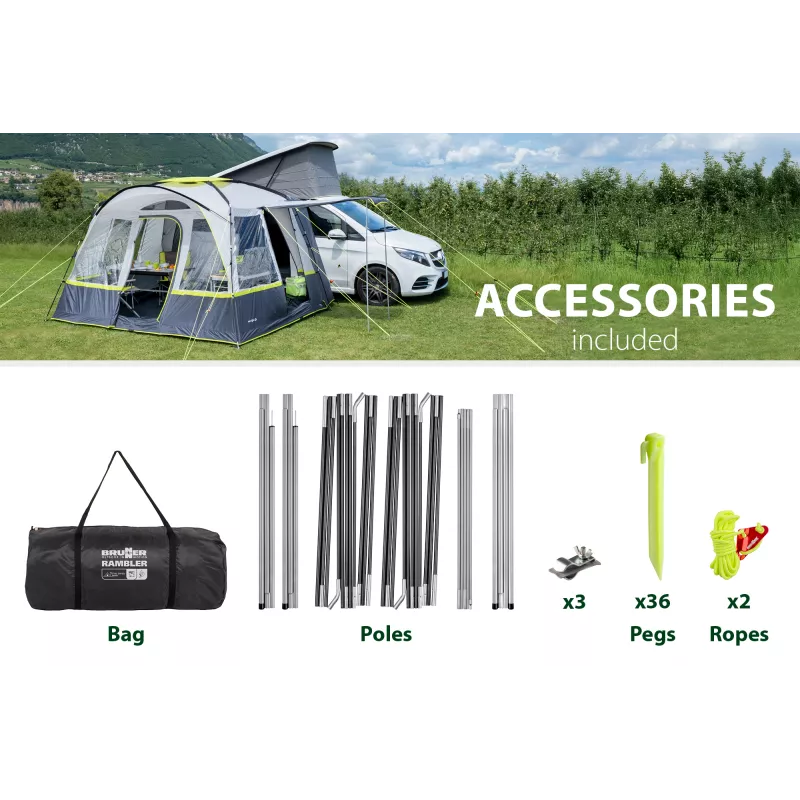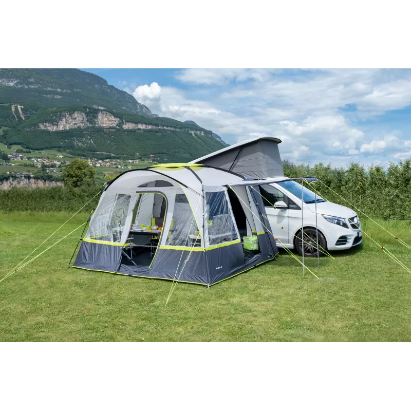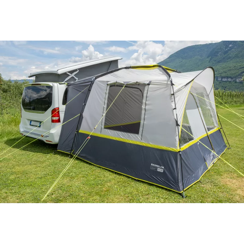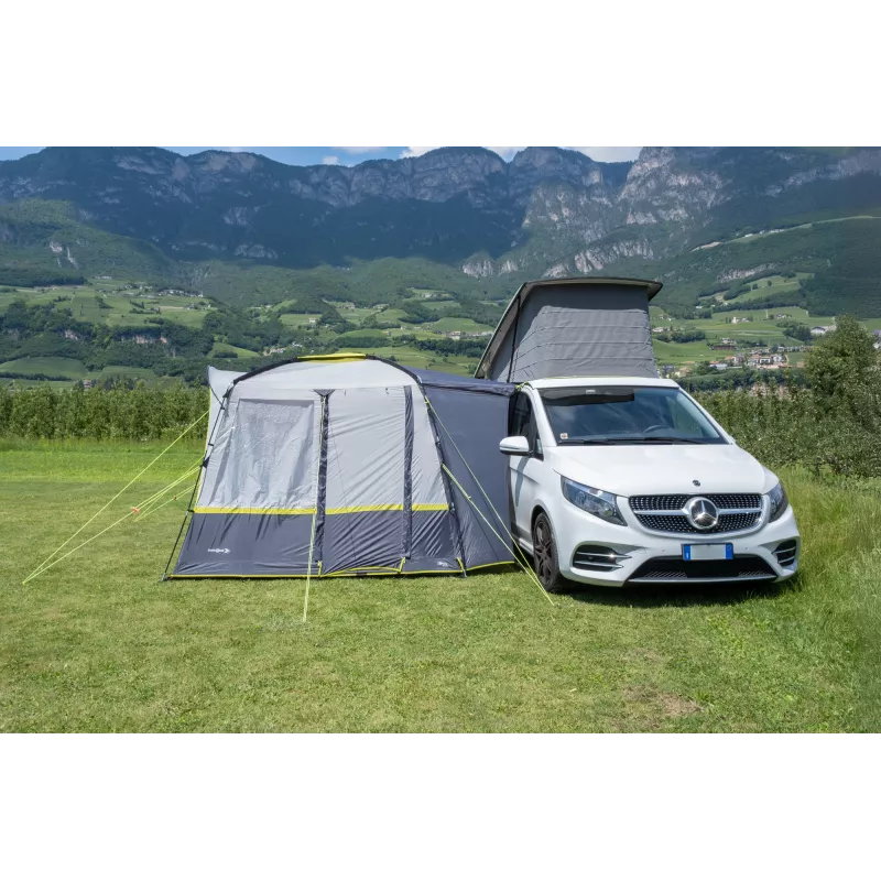 La Brunner Rambler è una veranda spaziosa e di concezione moderna, progettata per van e minibus e pensata per offrire comfort abitativo elevato, luminosità e massima flessibilità in campeggio. La struttura indipendente e collaudata consente di utilizzare il veicolo per escursioni o spostamenti senza dover smontare la veranda, rendendola ideale per soggiorni dinamici.