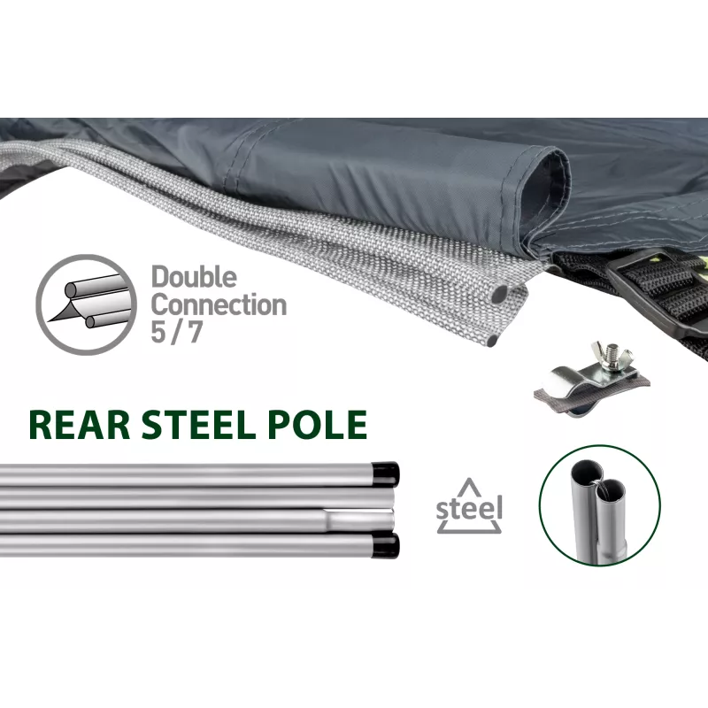 Il catino cucito a copertura totale rappresenta un elemento chiave della Rambler, offrendo una protezione efficace da acqua, umidità e insetti. La veranda dispone di due entrate, di cui una laterale alzabile a tendalino, e di una parete posteriore completamente apribile, che permette una gestione flessibile degli spazi e dell’aerazione.