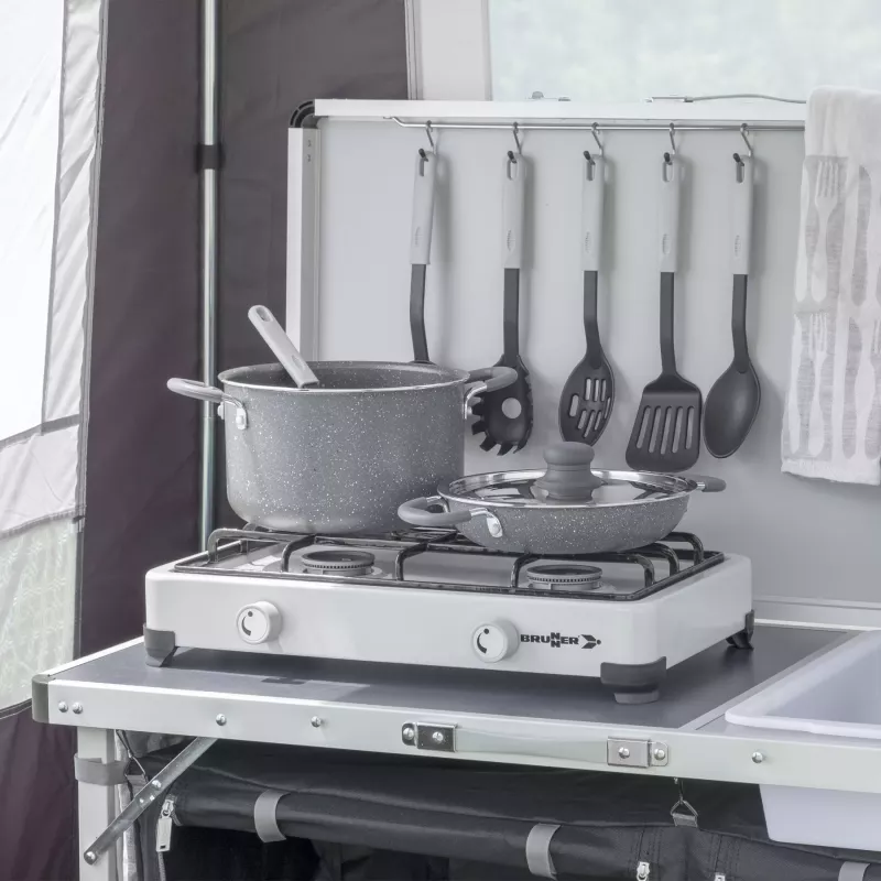 Questo set è ideale per chi cerca una soluzione affidabile, compatta e completa per la cucina in campeggio o in viaggio.