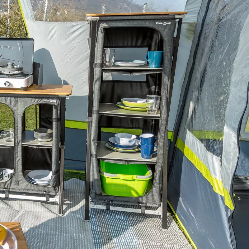 Il Brunner Mercury Cross HS SQ è un mobiletto da campeggio versatile e compatto, ideale per organizzare utensili, stoviglie o indumenti durante le attività all'aperto. La sua struttura leggera in alluminio e il design pieghevole lo rendono pratico da trasportare e facile da montare, offrendo al contempo stabilità e resistenza.