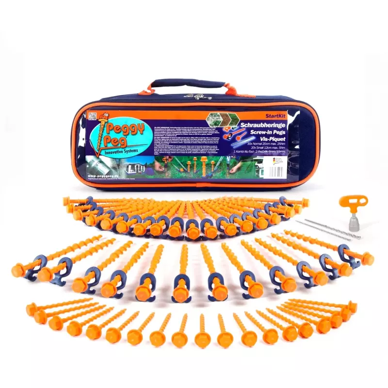 Set Starter kit di Peggy Peg, inclusa una pratica borsa per il trasporto. Tutto il necessario per il campeggio.