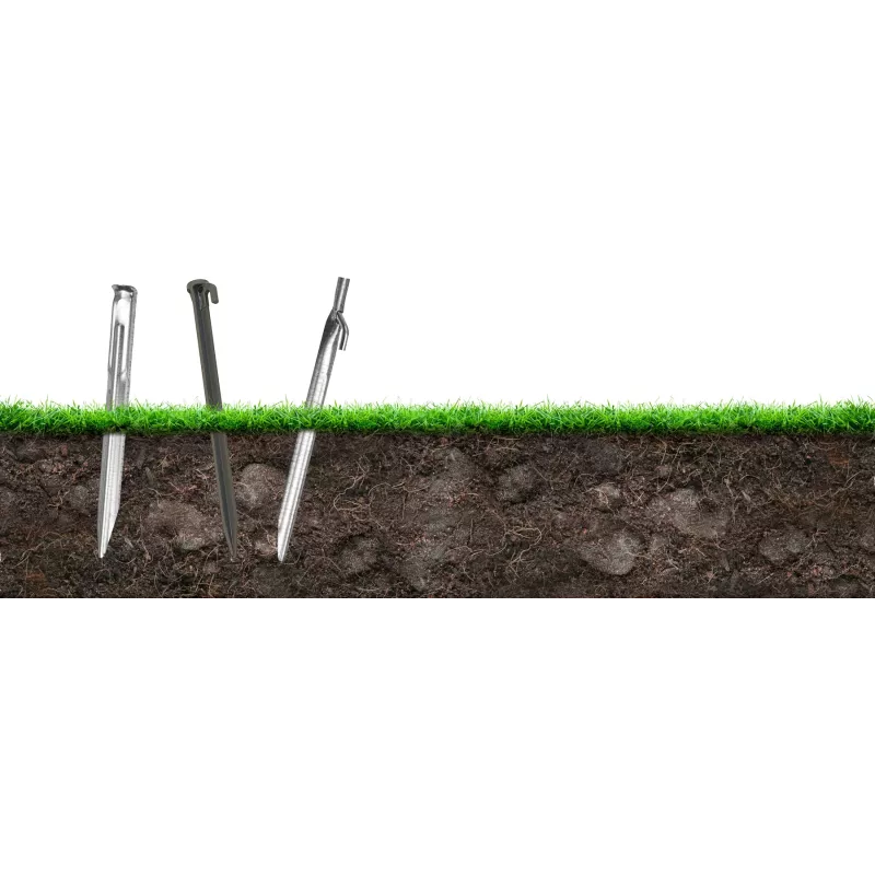 - Design robusto: La sua struttura solida è ideale per terreni difficili, come sabbia, ghiaia e terreni duri, migliorando la presa e impedendo che il picchetto si allenti facilmente.