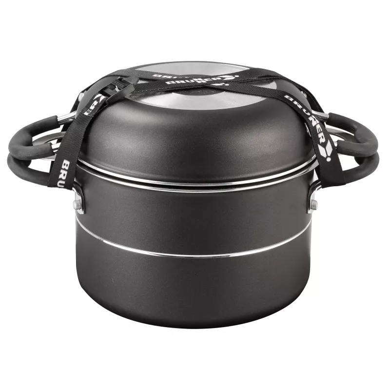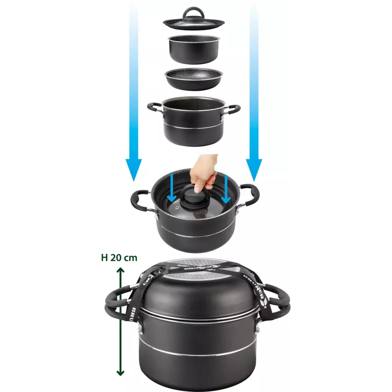 Il Brunner Popote Pirate NG 7+1 Ø 20 è un set di pentole da campeggio completo e funzionale, ideale per cucinare in mobilità durante le vacanze in camper, in tenda o nelle aree picnic. Grazie alla sua struttura impilabile e al rivestimento antiaderente di alta qualità, è perfetto per un uso pratico e veloce.