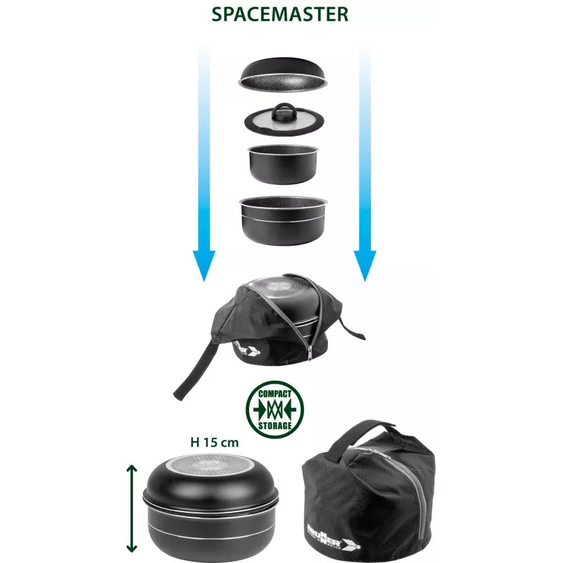 Il Brunner Pirate Spacemaster Ø 24 è un set di pentole compatto e leggero, progettato per offrire la massima funzionalità durante le attività all'aperto. Realizzato in alluminio con rivestimento antiaderente Stone Rock, è adatto a tutti i tipi di fornelli, inclusi quelli a induzione.