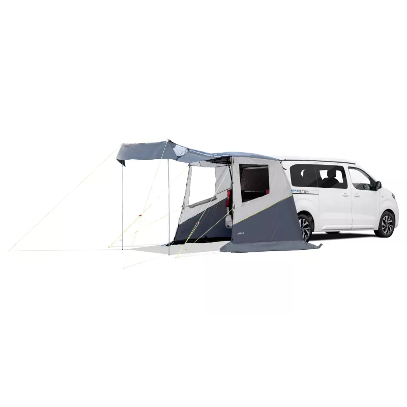 La Brunner Escape è una tenda posteriore di nuova concezione, progettata per il fissaggio diretto al portellone posteriore di veicoli con struttura identica come Peugeot Traveller, Citroën Spacetourer e Toyota Proace. Ideale per chi cerca una soluzione pratica e veloce, permette di ampliare lo spazio abitativo del veicolo in pochi minuti.