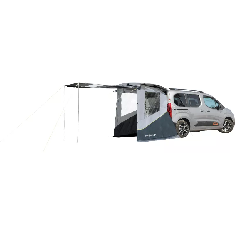 La Brunner Bunker è una tenda posteriore senza telaio di concezione avanzata, progettata per un fissaggio rapido e preciso al portellone posteriore di veicoli con struttura identica quali Citroën Berlingo, Peugeot Rifter, Opel Combo, Fiat Doblò e Toyota Proace City. Ideale per chi viaggia in van compatti, amplia in modo significativo lo spazio interno creando una zona confortevole per pranzo, relax e stivaggio.