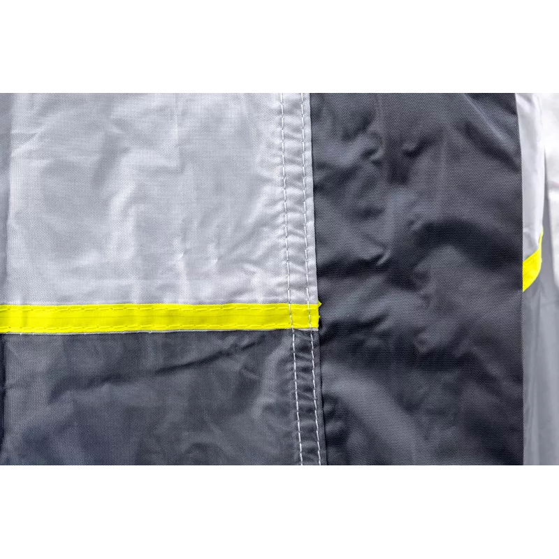 Il fissaggio al veicolo avviene tramite robuste cinghie che assicurano una tenuta stabile al portellone posteriore. Le pareti laterali vengono ancorate direttamente alla carrozzeria e tese nella parte inferiore, garantendo una protezione efficace dalla pioggia. La parte bassa della tenda aderisce perfettamente al veicolo, mentre il paraspruzzi esterno convoglia l’acqua lontano dalla struttura, migliorando la protezione in caso di precipitazioni.