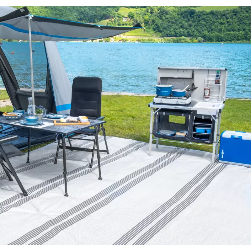 Perfetta per l’uso in campeggio sotto verande, tende, camper o roulotte, è realizzata in tessuto polipropilenico traspirante, lavabile e resistente ai raggi UV, assicurando un ambiente pulito, sicuro e confortevole. I bordi rinforzati con occhielli metallici agli angoli consentono un fissaggio stabile e duraturo in ogni situazione.