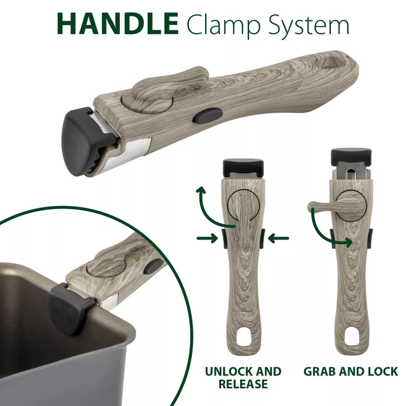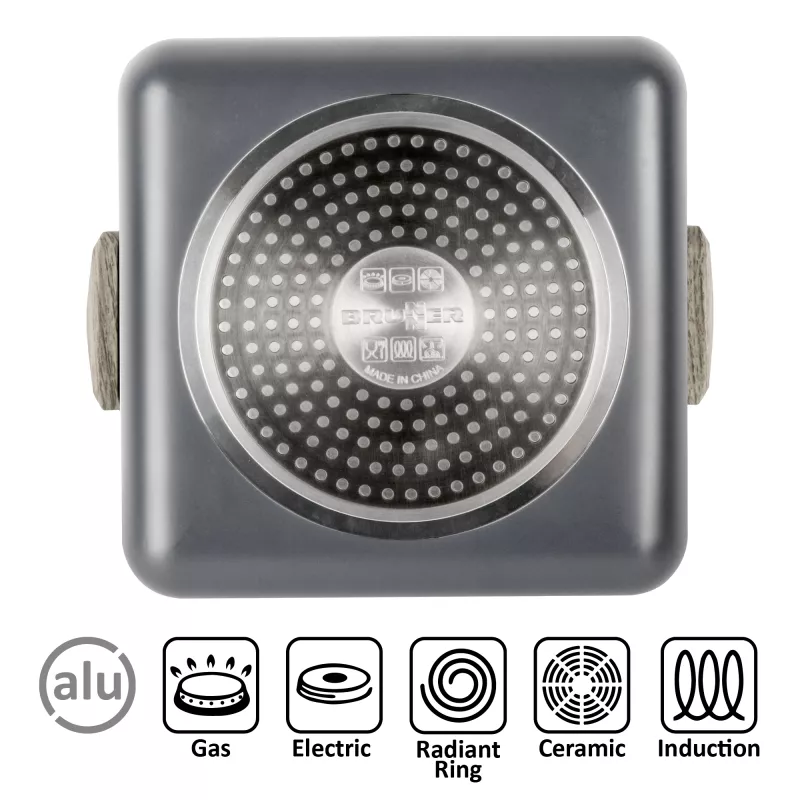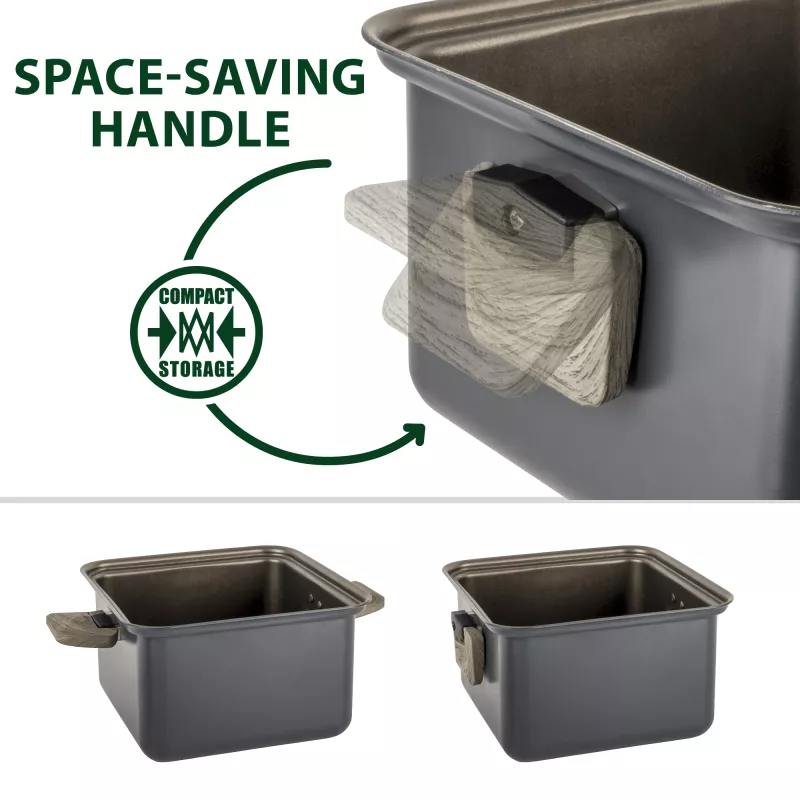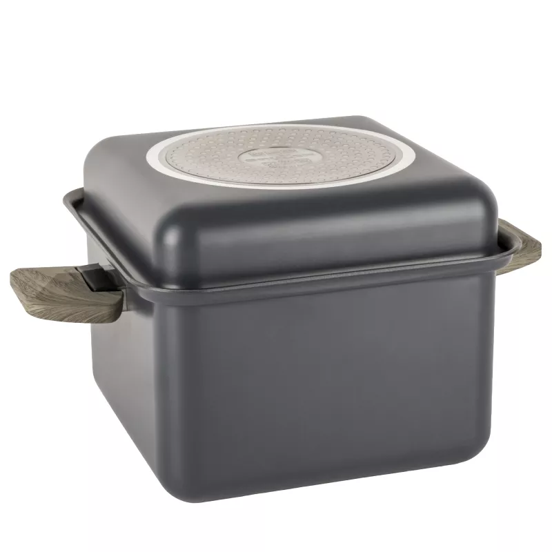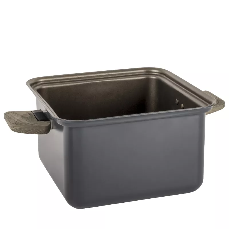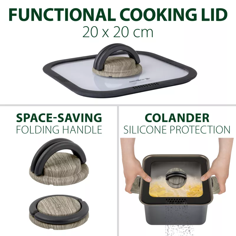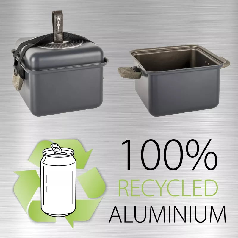 La pentola e la padella esterne, entrambe con dimensioni 20 × 20 cm, sono realizzate in alluminio riciclato di alta qualità, una scelta ecologica che garantisce al tempo stesso robustezza e distribuzione del calore uniforme, per una cottura efficiente e controllata. Il design quadrato consente inoltre di sfruttare meglio la superficie del piano cottura e lo spazio nei mobili.