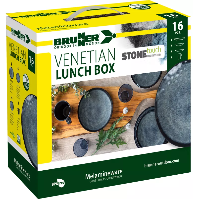 Il set Brunner Lunch Box Venetian è la soluzione ideale per chi desidera unire eleganza e funzionalità durante le proprie avventure all'aperto. Realizzato in melamina di alta qualità con finitura "Stone Touch", questo set da 16 pezzi offre un design raffinato e una resistenza superiore, perfetto per campeggi, picnic e viaggi in camper.