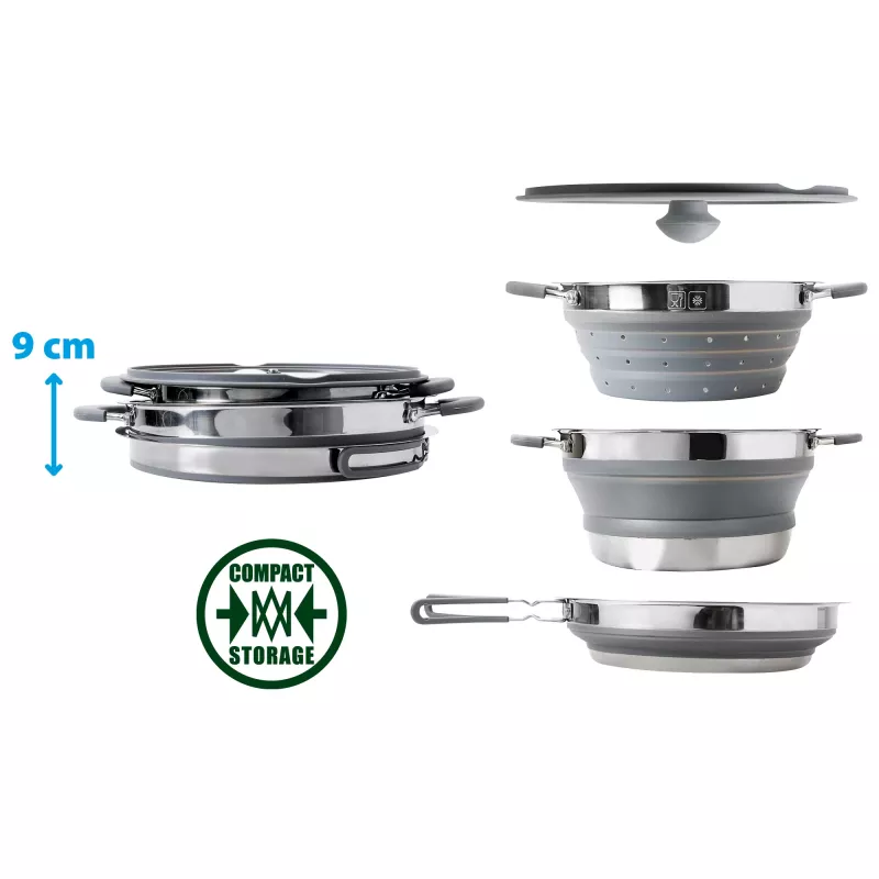 Questo set è ideale per chi cerca una soluzione affidabile, compatta e completa per la cucina in campeggio o in viaggio.